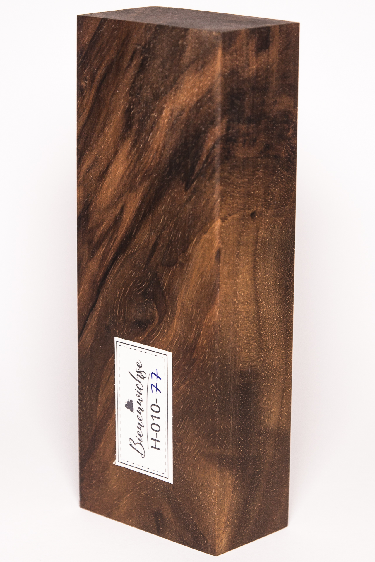 Unsere Messergriffhölzer werden durch ein Vakuum-Druckverfahren mit NOVACURE Acrylharz stabilisiert, wodurch sie robuster und nahezu verzugsfrei werden. Solche Hybridhölzer bieten eine höhere Dichte und Festigkeit, ähnlich tropischen Harthölzern, und sind damit ideal für Messergriffe, die in der Küche oder im Outdoor-Bereich zum Einsatz kommen. Sie lassen sich problemlos mit herkömmlichen Werkzeugen bearbeiten, und das Kleben gelingt mit handelsüblichen Epoxid- oder Cyanacrylatklebern.